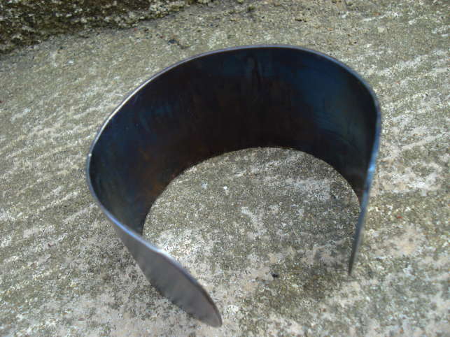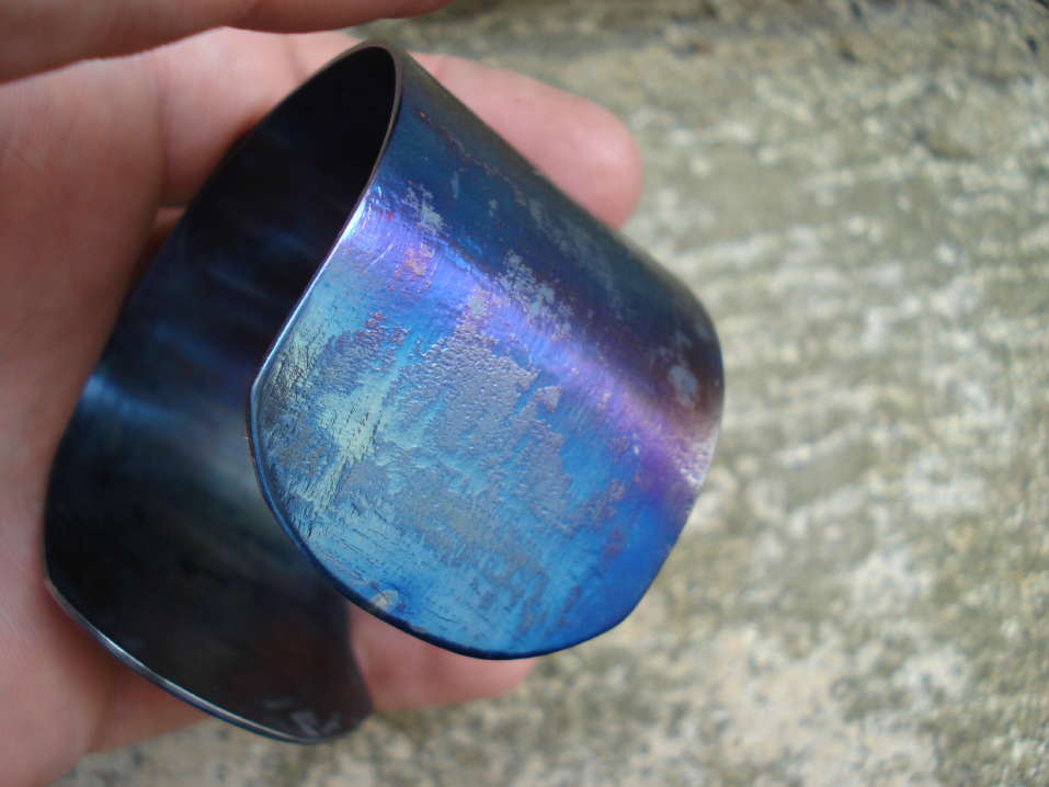 Le titane chauffe très vite, mais refroidit également très vite. On ne peut guère donner plus de 5 coups de marteau (surtout que le plat faisait 1,5mm d'épaisseur). Il m'a fallu au moins une douzaine de chauffes pour arriver à le mettre en forme totalement.