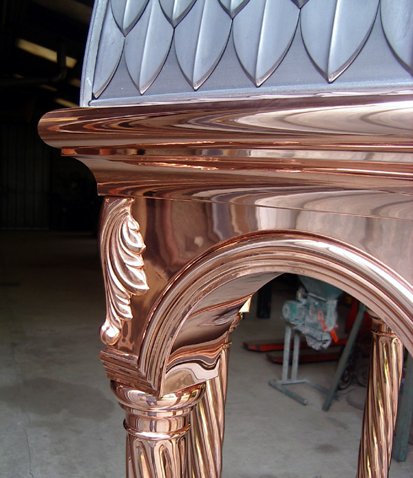 Les feuilles sont repoussées sur une forme, c'est le "repoussé sur relief : technique déja employée au moyen-âge, contrairement aux feuillages en ferronnerie où elles sont faites en "repoussé-relevé", autre technique !