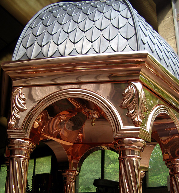 - Une fois la forme finie, on plaque dessus la tôle de cuivre en la bridant et l'on repousse.