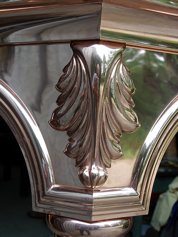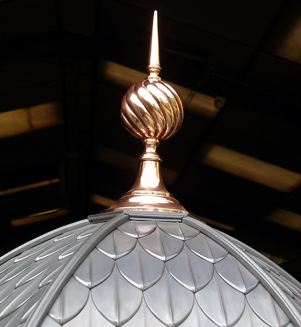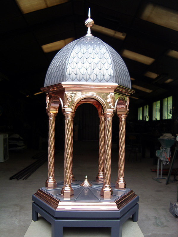 - Cuivre et plomb repoussés. Certains éléments sont repoussés au tour : haut et bas des colonnes, épi de fâitage, rosace au centre ;