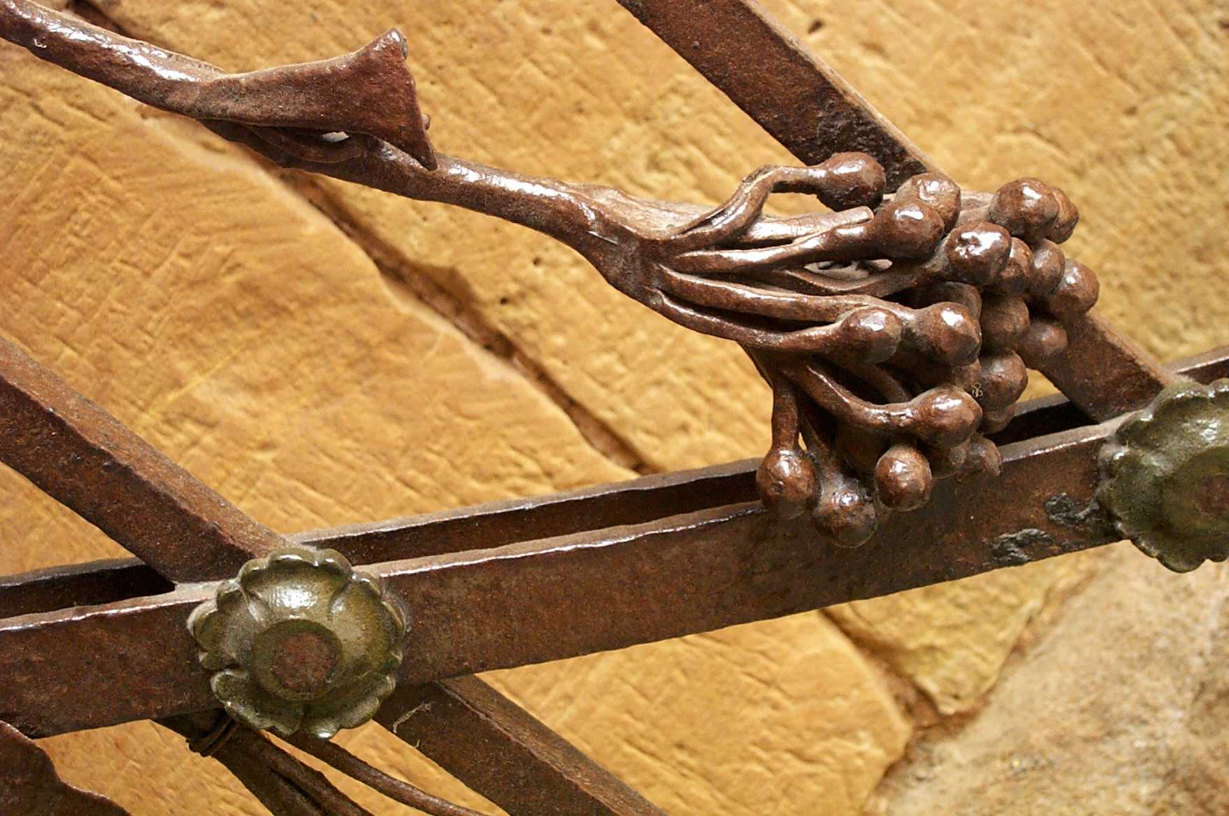 Aujourd'hui, bien qu'un peu en retard, je réponds à ce sujet car j'ai eu à faire une branche de raisin qui décore un des montants de mon puits. Pour la grappe, j'ai préparé un moule en pâtre composé de deux parties identiques dont les creux ont été formé par une bille. Les deux pièces de ce moule ont été ensuite rapprochées et bien serrées l'une à l'autre au moyen d'un coffret en bois et de vis. En fait ce moule était prévu pour couler 3 "grains à la fois". Un perçage sur la calotte inférieure de chaque cavité me permettait de couler du plomb en fusion. Auparavant, j'ai préparé de petits crochets en fil de cuivre que je passait dans le trou de remplissage, servant à la ligature des grains pour le montage. Le démoulage était facilité par l'ouverture rapide des deux parties du moule. L'assemblage des grains a donc été réalisé par ces fils de cuivre soudés de temps en temps à l'étain ensemble en formant une grappe en fuseau. Il faut dire que le moule très abimé en fin de travail n'aurait pas résisté encore longtemps à la température du coulage. Pour les feuilles, j'ai découpé de la tôle de 15 1/10ème en forme de feuille de vigne (4 grandeurs différentes) formées à la meule, quelques coups de burin pour marquer les nervures, soudé des tiges. Puis j'ai réalisé le montage de tout ceci sur un fer rond lisse de 8mm, cintré en divers endroits. Voilà ma technique, la peinture à la bombe de plusieurs couleurs donne un effet assez réaliste.