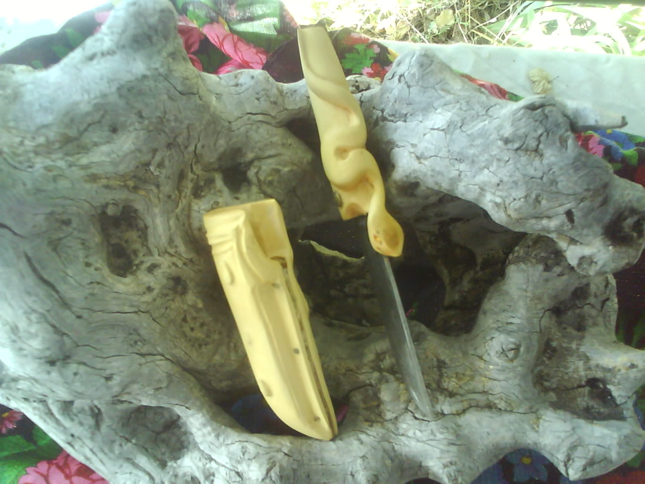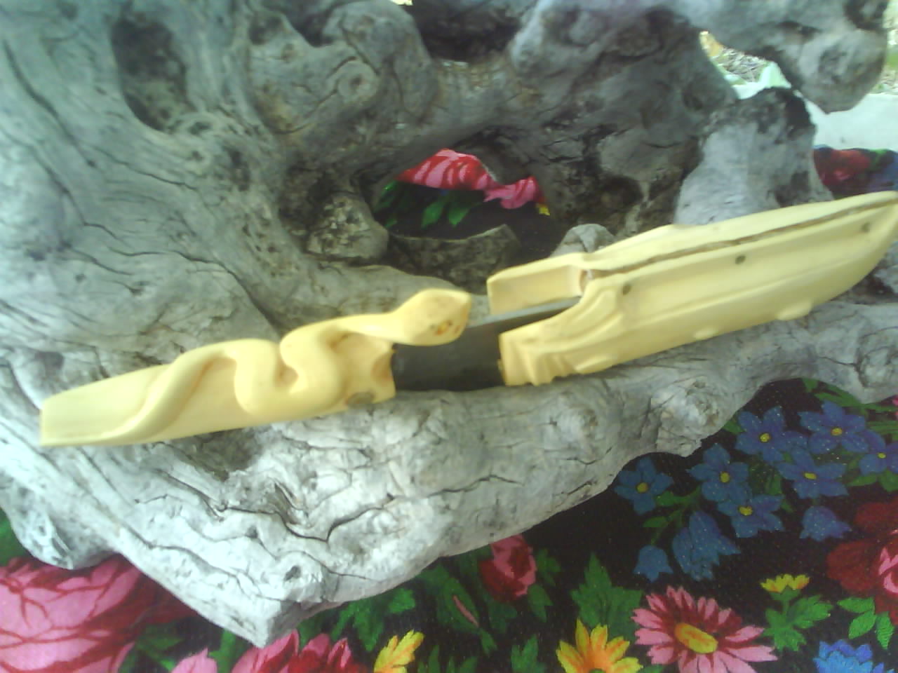 C'est un couteau en acier agricole de longueur approximative 17 centimètres, épaisseur 2,5 centimètres. Ni trempe, ni revenu : c'etait mon premier couteau. Le manche est en buis, collé et chevillé ; la vipère sculptée au cutter et à la dremel.