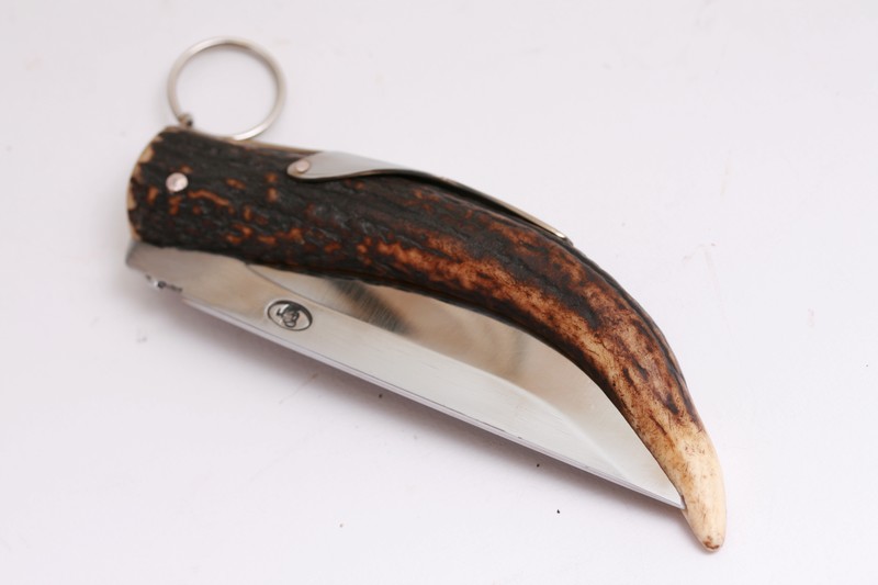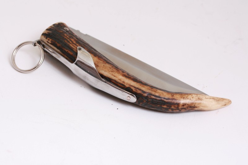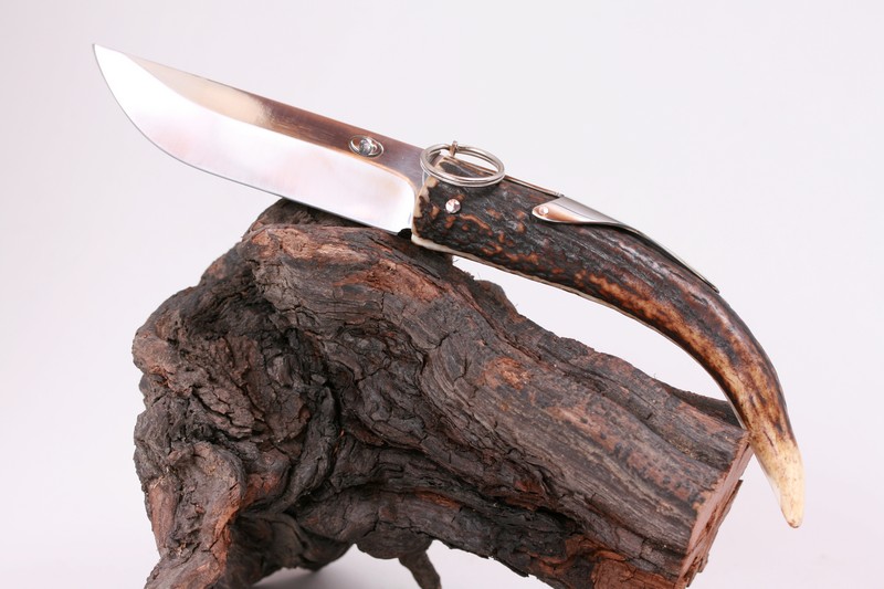 La lame est en acier carbone XC75, le ressort en inox Z20, et le manche en bois de cerf.