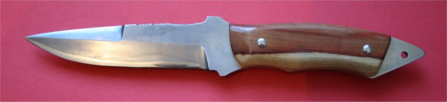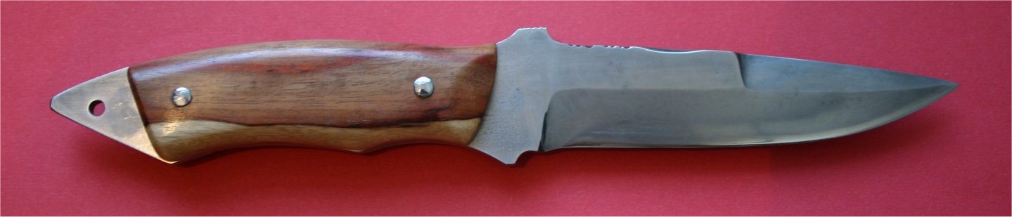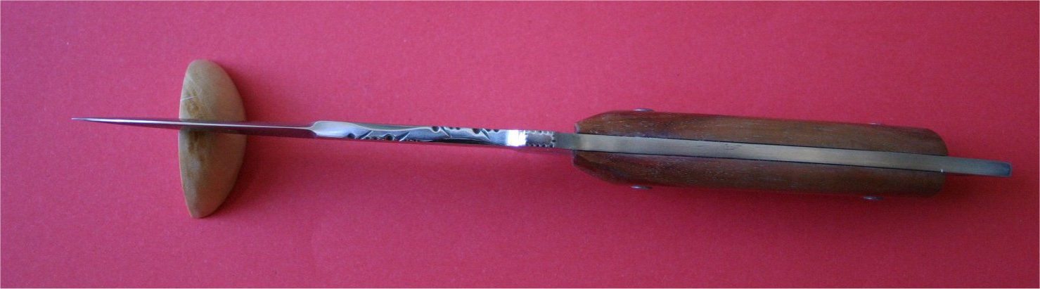 La lame est réalisée en stock removal dans un acier XC75, la trempe est sélective manuelle et à l'huile.