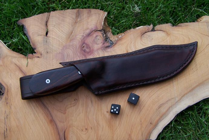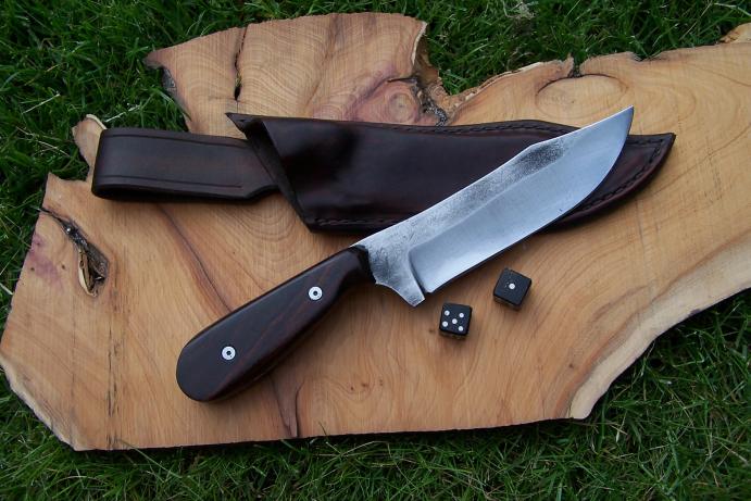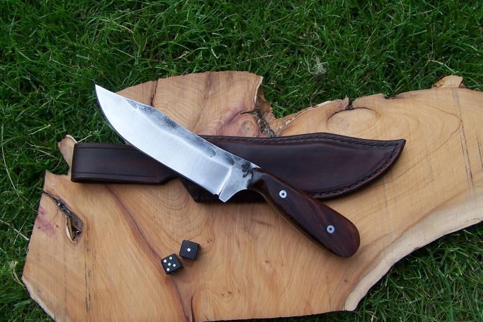 Il est forgé en XC75 avec des plaquettes vissées en palissandre. Il mesure 26 cm dont 14 cm de tranchant. L'étui est réalisé comme d'habitude par ma femme. Et si vous observez bien il est moulé.