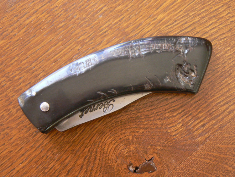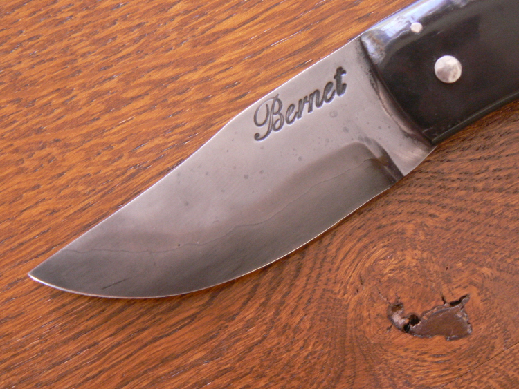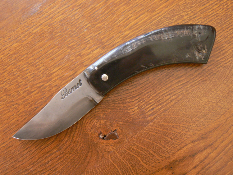Mon premier couteau à lame sandwich : une tranche de xc75 entre deux tranches de 15n20, manche en corne de bouc, et d'une longueur de 19,5 cm.