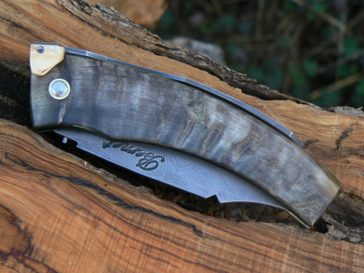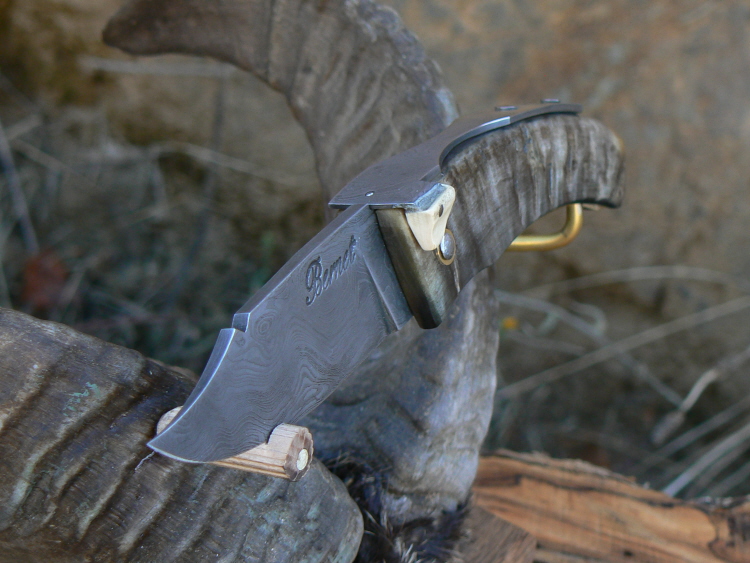 Le manche est en corne de mouflon, la lame et le ressort en damas, la palette du ressort est en ivoire de mammouth.