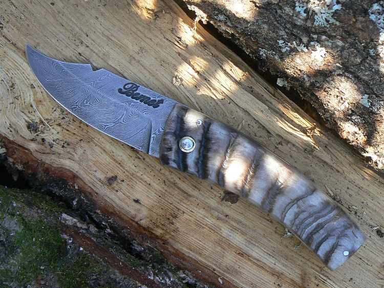 Le manche est en corne de mouflon, la lame en damas à deux barreaux torsadés de 144 couches.