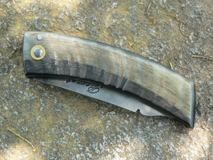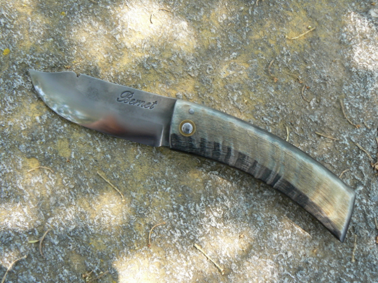 Il est forgé dans du xc75. Le manche est en bélier sur lequel j'ai laissé la croute.