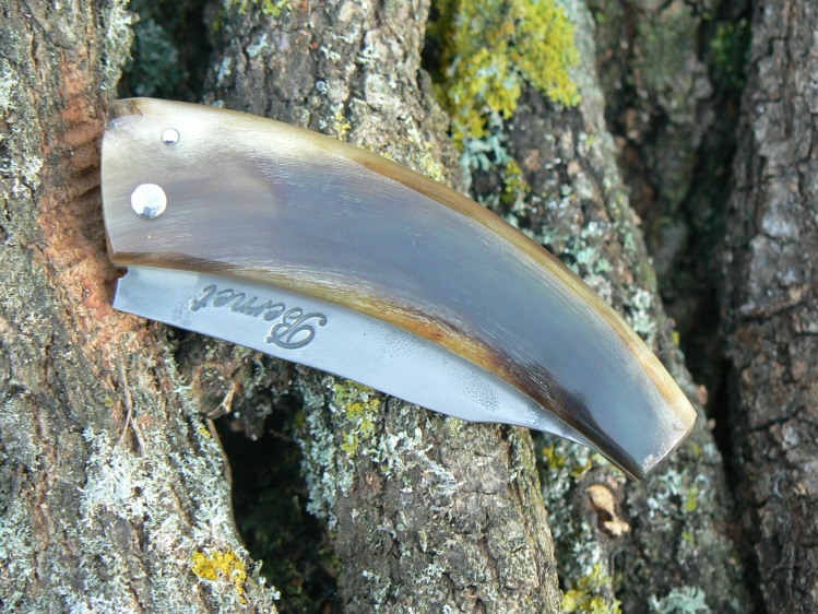 Voici un couteau deux clous traditionnel : lame en xc75 forgée, trempe sélective, montage sur rondelles téflon, et corne de mouflon.