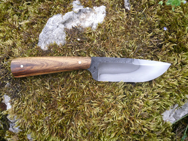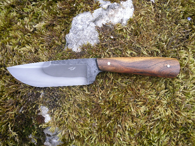 Voici un couteau droit à manche en pistachier dont les mensurations sont de 20 cm dont 10 de lame, 3,5 mm en épaisseur et 3 cm de haut. Le contre tranchant n'est pas affuté et la trempe est sélective au mastic réfractaire.