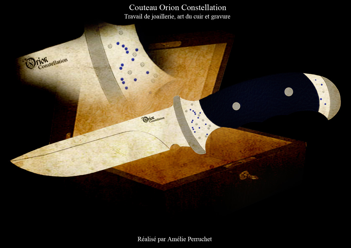 ¤ Description : Alors grande remarque : il n'y a pratiquement pas de gravure sur le couteau. Bien qu'étant graveur-ciseleur, j'aime également aborder des sujets qui ne sont pas en relation directe avec la gravure, notamment celui de la joaillerie et l'art du cuir. Il s'agit d'un projet de Luxe. Je vous présente la réalisation de la constellation d'Orion avec l'agencement de diamants blancs pour les étoiles les plus grandes et de diamants bleus pour les plus chétives. La constellation est donc représentée à gauche du manche [Elle est à regarder dans le sens que vous offre la photographie]. Sobriété du design et des couleurs, afin que le sujet principal abordé sur ce projet, soit le seul et unique sujet.