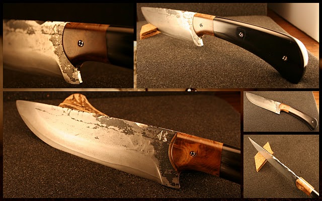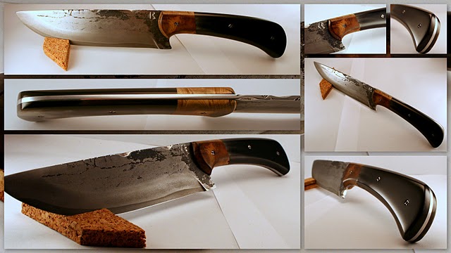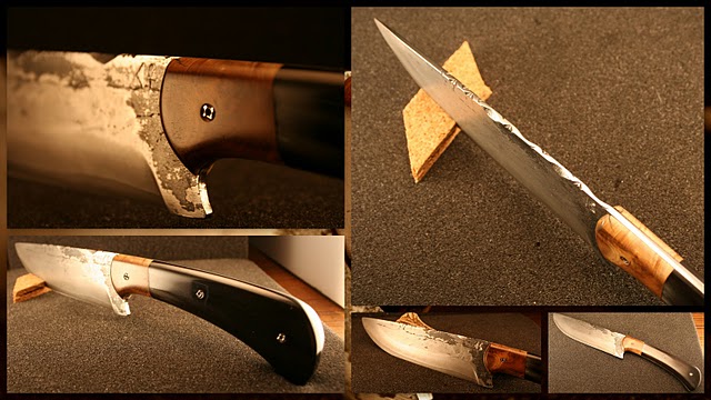 Personnellement, avec un manche aussi soigné, j'aurais vu une lame un peu moins "brut de forge", mais je suppose que tu as cherché le contraste. Et pour finir, je souligne l'épaisseur raisonnable de la lame, je trouve que l'on voit trop souvent des couteaux très lourds avec des lames trop épaisses.