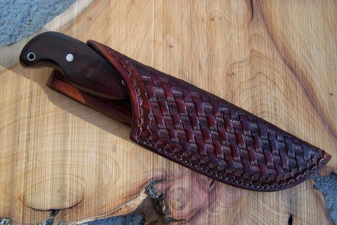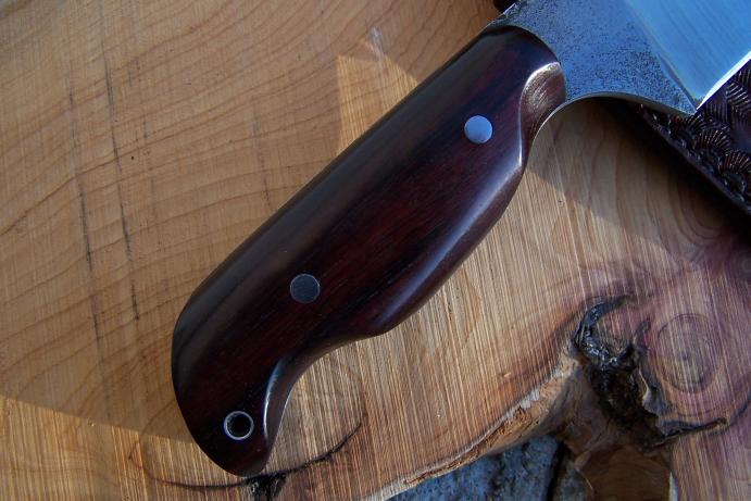 Ce couteau est inspiré de la forme particulière du Nessmuk, forme que j'affectionne. Il est en XC75 avec une trempe à l'huile. Ses plaquettes sont en palissandre rouge et avec un veinage noir (les photos ne rendent pas assez bien la couleur). Il mesure 23 cm pour 12 cm de tranchant.
