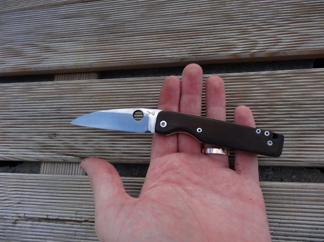 Les points à travailler sont la forme du talon de la lame pour que le chemin du ressort soit fluide et facilité ; et également travailler l'ajustage des pièces de façon à arriver à la perfection de Raphaël Durand ou de Jérôme Havoaere par exemple, où l'on ne voit même pas la jonction ressort-lame. Mais je suis quand même plutôt content du design et du résultat, même si concernant le ratio manche-lame, je pourrais avoir 1/2 centimètre de plus sur celui-ci.