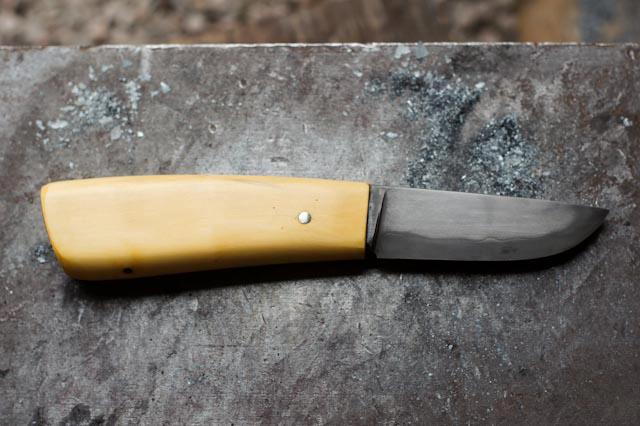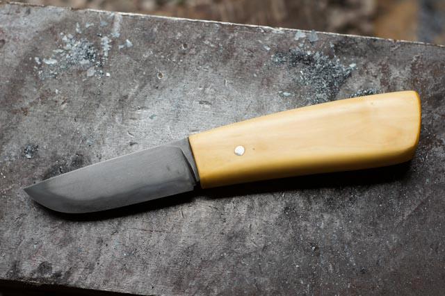 Donc la lame est en sandwich : au centre un morceau de C130, sur les flancs deux morceaux de C45. Il y a 4,5 millimètres d’épaisseur au plus épais sur la lame et 8 centimètres de long, 105 millimètres pour le manche en buis et environ 18 millimètres d’épaisseur. Il n'y a pas de garde.