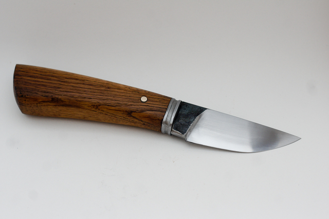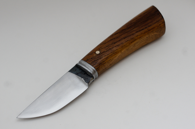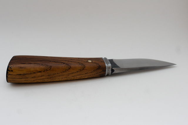 Le manche de 11cm est un vieux morceau de chêne. La garde, légèrement plus travaillée qu'à mon habitude, est toujours en fer.