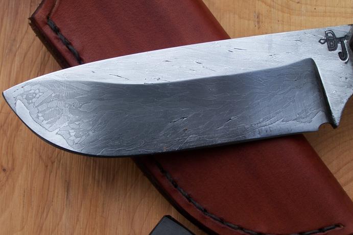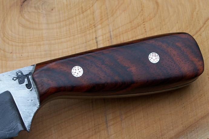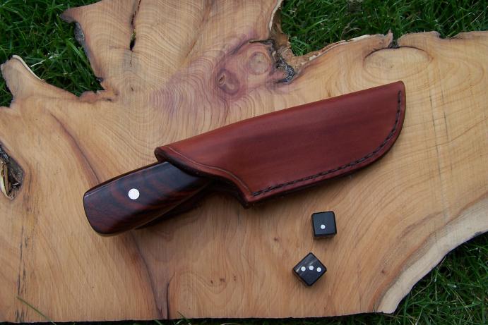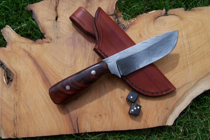Revoilà un nouvel essai de damas câble avec une âme en 90MCv8. Les plaquettes sont en cocobolo debout avec rivet moaïque. Le couteau mesure 20 cm dont 10 cm de tranchant. L'étui est comme toujours réalisé par ma femme.