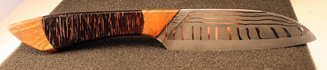 C'est mon fils qui s'intéresse à ce que je fais qui l'a ressorti et m'a donné l'idée des matériaux à utiliser pour habiller cette lame. J'ai trouvé ses idées intéressantes (reproduire les dessins de la lame avec les matériaux) et voila ce que cela donne.