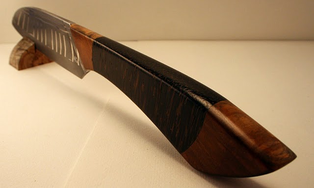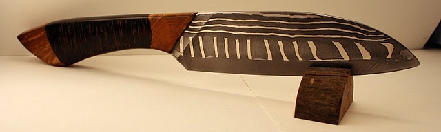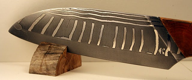 J'avais fait un test de soudure pour un damas feuilleté et mosaïque afin de m'entrainer et m'améliorer. Les soudures se sont bien passées mais le dessin du damas ne me plaisait pas parce que trop grossier. Donc elle trainait là sur une étagère en attente d'inspiration.