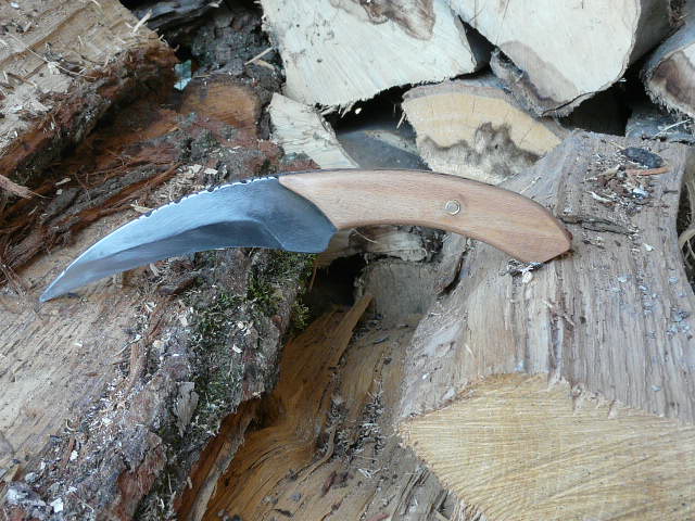 je reviens vous voir avec ce modèle de 23 cm dont 13 de lame et un tranchant de 10,5 cm usiné à la main dans de l'acier ressort plat de 50mm de large après un recuit.