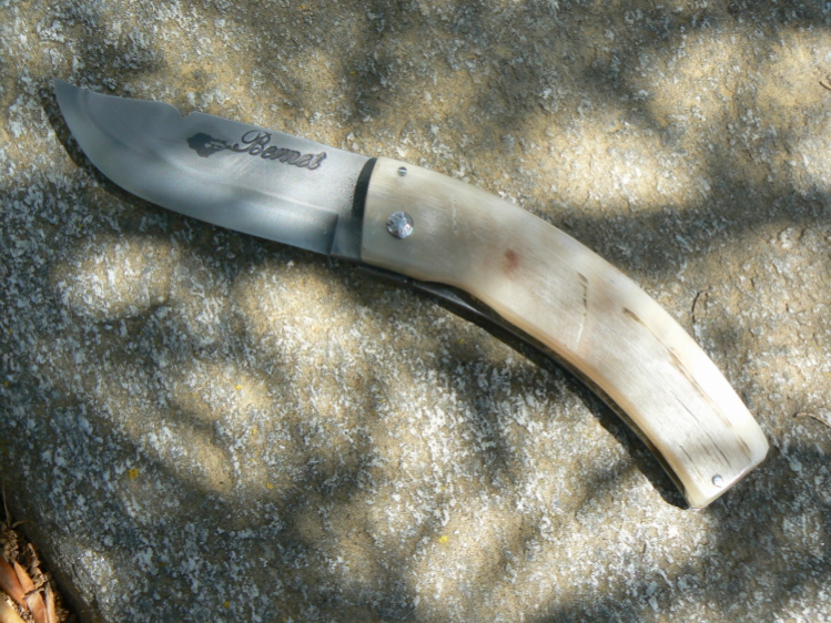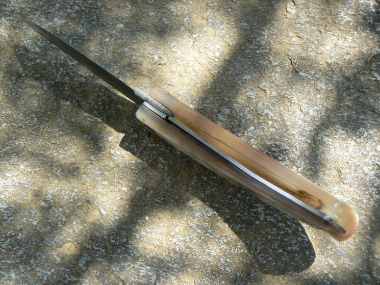 Voici le dernier couteau : un liner lock, encastré dans un plein-manche en bélier et lame en XC75, trempe sélective.