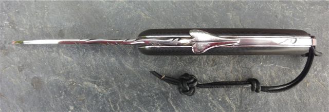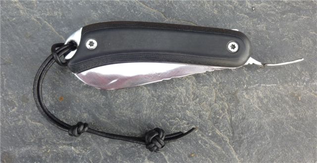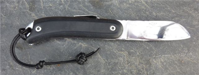 J'ai repris la forme du petit liner-lock pour ce petit couteau piémontais de 70mm de tranchant, toujours forgé dans une lame de ressort. Ce micarta noir-gris est d'un bel effet et très facile à travailler. J'ai surtout cherché à faire une lentille originale, là encore, avec cette feuille de salsepareille, la calamité de nos jardins provençaux, aux grappes de fruits d'un rouge superbe, et avec les fleurs grâce auxquelles on peut confectionner une liqueur au parfum merveilleux...