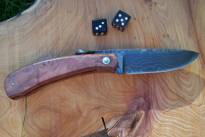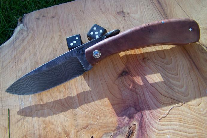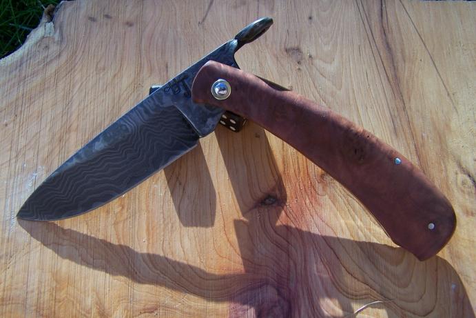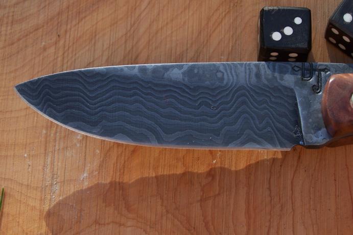 Voilà une de mes dernières créations : un piémontais fait en damas réalisé avec du 90MCV8, 15N20 et du 110WLV5, ce qui lui donne un tranchant redoutable.