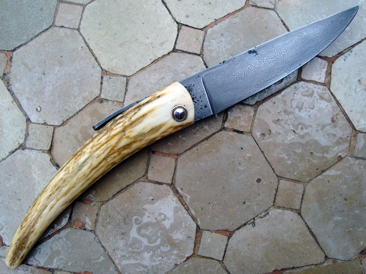 Voici un couteau façon piémontais, entièrement forgé dans un damas de ma fabrication composé de 224 couches de XC75 et 90mncrv8. Le manche est en bois de cerf plein manche.