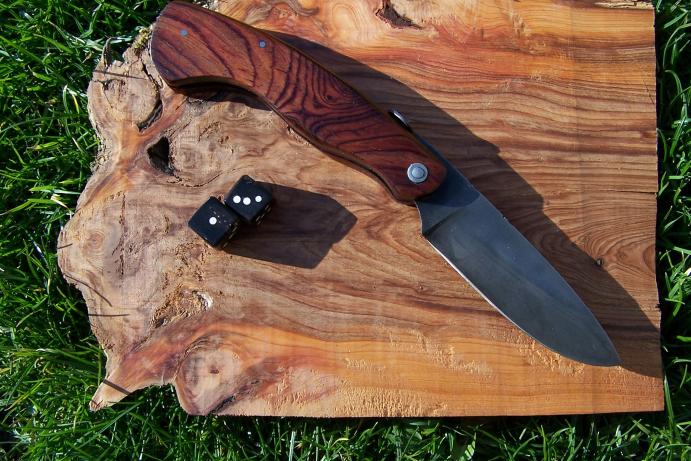 forgé dans du XC75 trempe sélective au goops, il mesure 13 cm fermé et 22 cm ouvert. Les plaquettes sont en cocobolo.