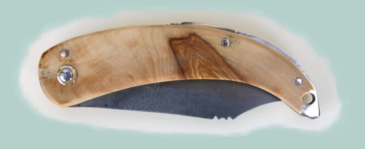 Le manche est en bois d'olivier de Corse, il est plus court que les platines et se termine par une forme en rappel du guillochage de la lame et laisse apparaître un trou dans les platines pour passer un lien.