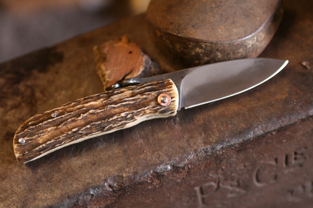 La lame a été faite en stock removal avec intercalaire en XC75 et a subi des normalisations puis une trempe sélective et un revenu "sauvage". La lime ne mord pas et après affutage, le tranchant est très satisfaisant et tient bien dans le temps.