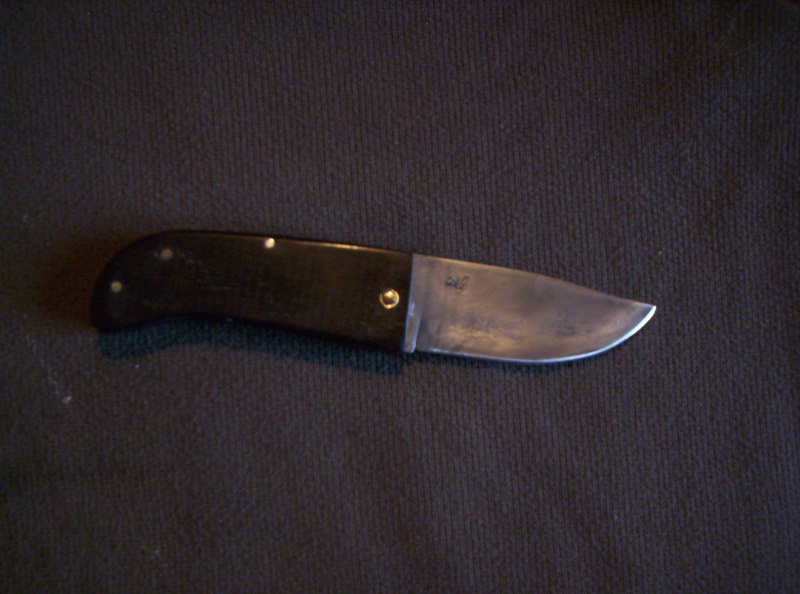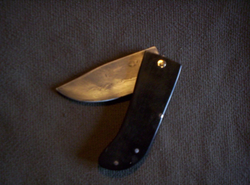 La lame est forgée en 15N20, trempe sélective à l'huile, manche en ébène, intercalaire en 15N20, rivets en acier et laiton.