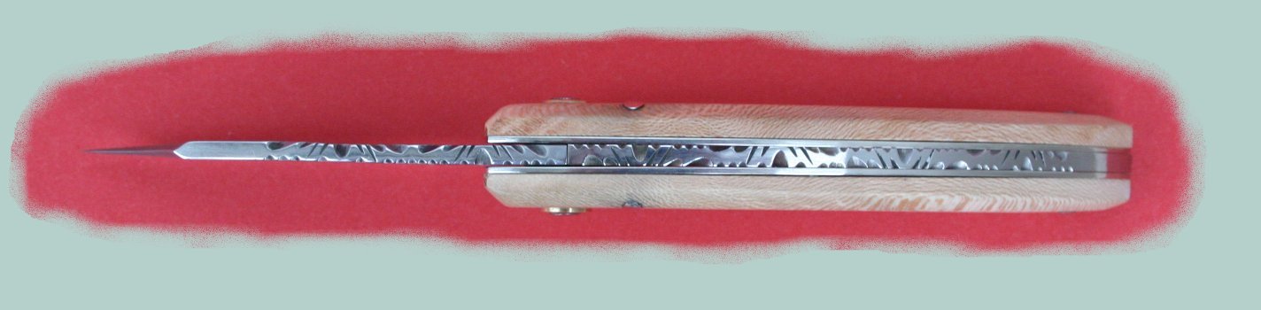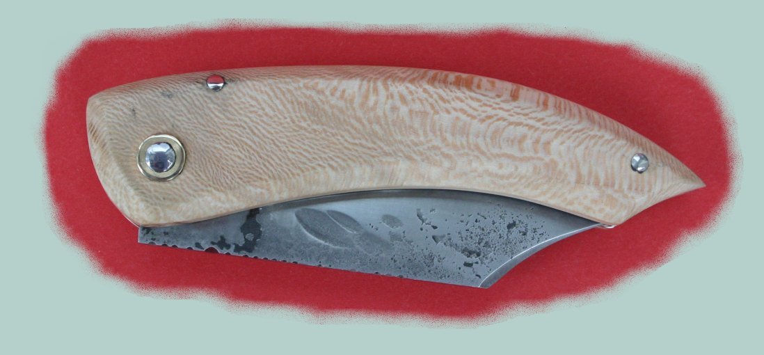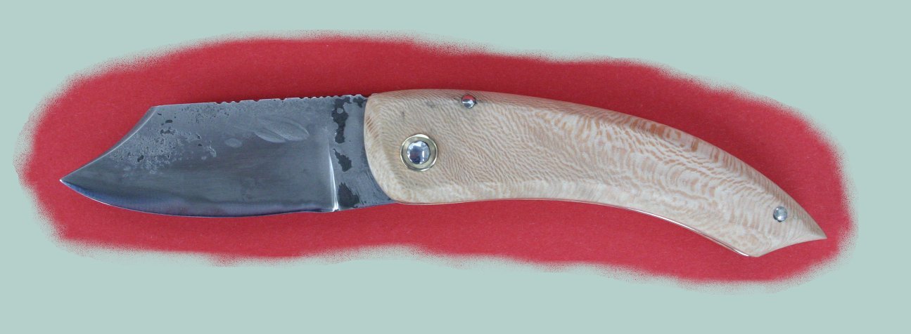 C'est un pliant style corse à friction. La lame forgée est en XC75, trempe à l'huile avec une finition par un traitement au perchlorure de fer et patinage à la main à la laine d'acier.