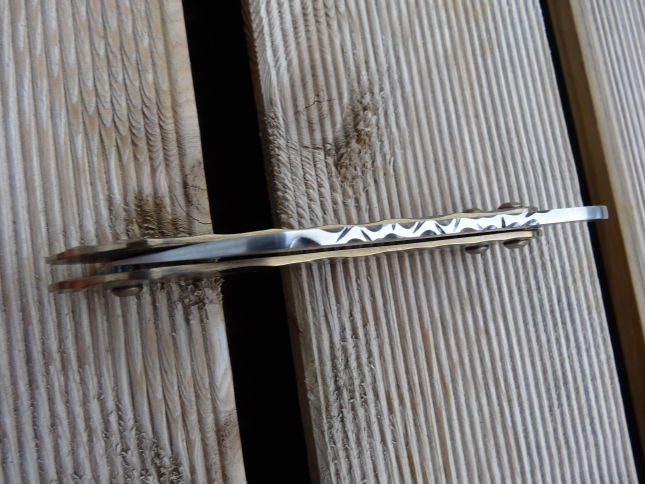 La lame est en acier 115w8, trempée à 810°C à l'huile après un maintien de 5 minutes au four, revenue à 210°C.