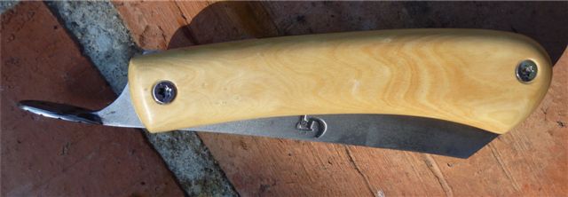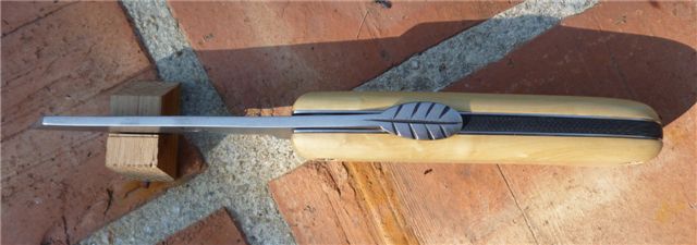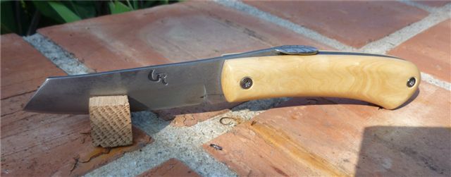 Ceci dit, j'ai "recyclé" la lame d'origine, que je vais garder pour moi je pense, avec un nouveau dessin du manche, et surtout ce beau morceau de buis (du Jura) qui se marie plutôt bien avec un intercalaire en micarta.