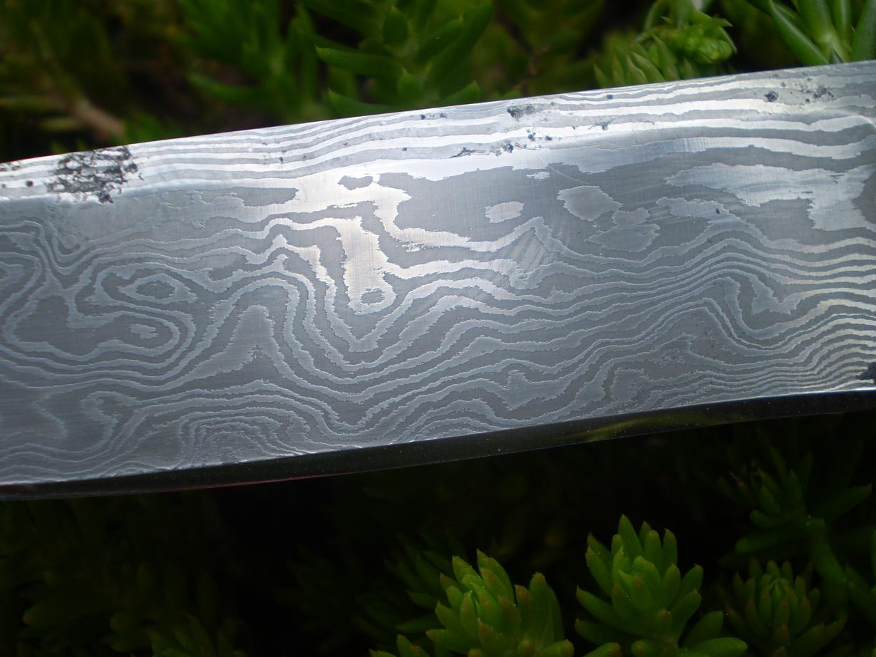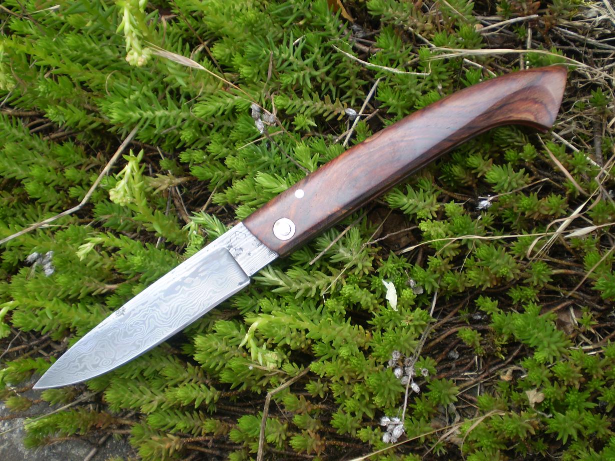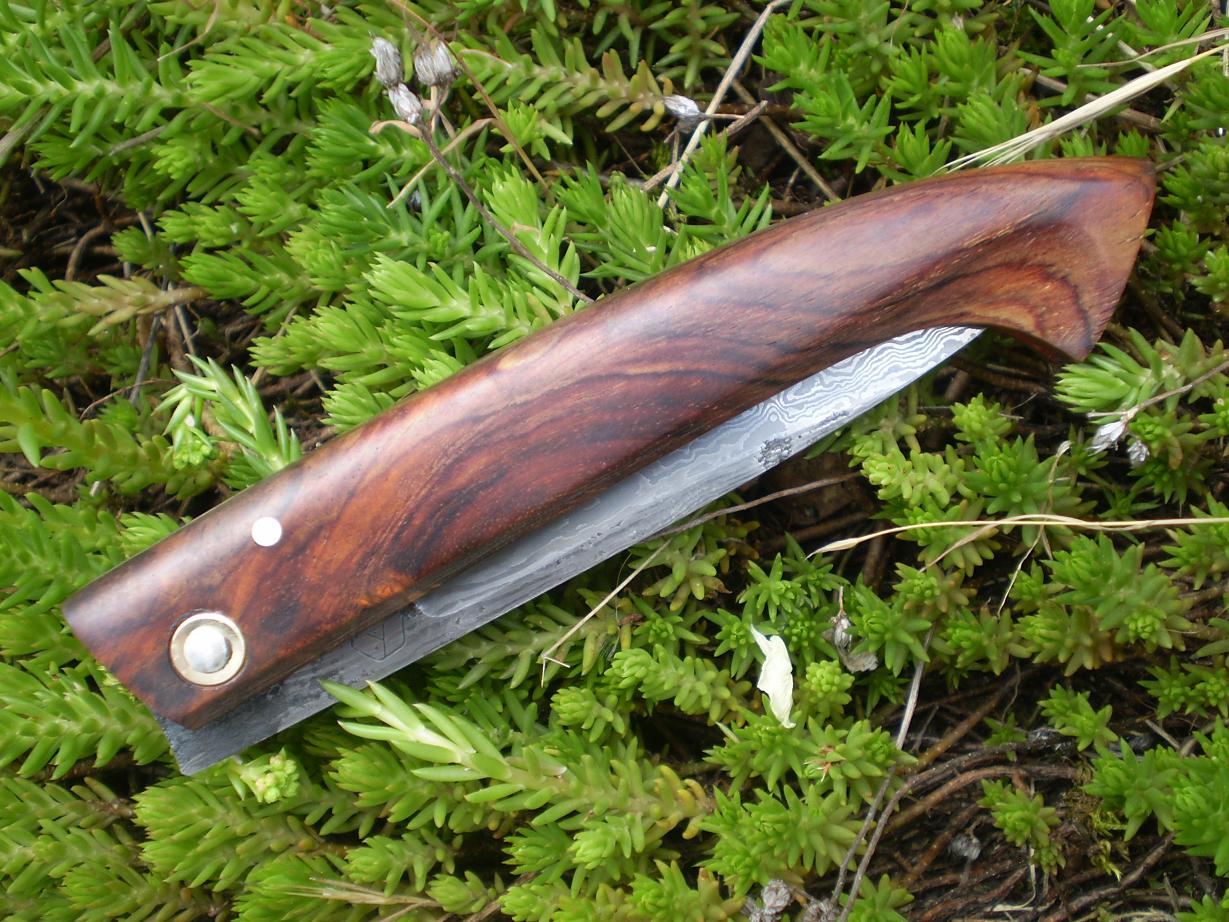 Un autre deux clous qui reçoit une lame en damas 100C6 et 75Ni8 et un manche en cocobolo. Le montage est encore sur rondelles téflon à l'intérieur et rondelles laiton à l'extérieur.