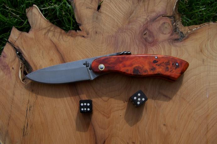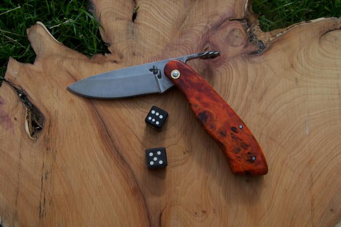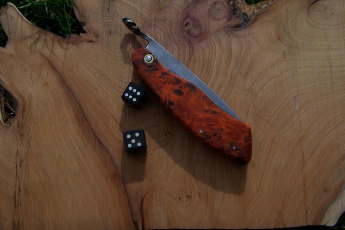 Voila un couteau qui ne devrait pas se perdre... J'ai choisi cette couleur car je la trouvais insolite. Il s'agit d'un bois teinté et stabilisé : de la loupe de peuplier.