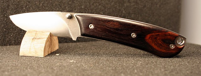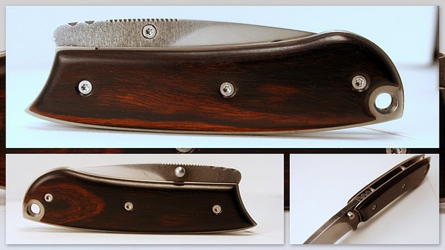 Voici le même couteau pliant que le précédent mais monté différemment (plaquettes plus petites que les intercalaires, 1 seul thumb) :