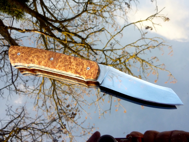 Couteau pliant liner lock de Michel Prévost, à plaquettes en loupe d'érable