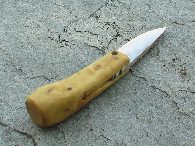 La lame du couteau est en sandwich en inox et acier 1.2442 (ou 115W8) qui a subi une trempe à l'huile, une double revenu d'une heure à 200°C.