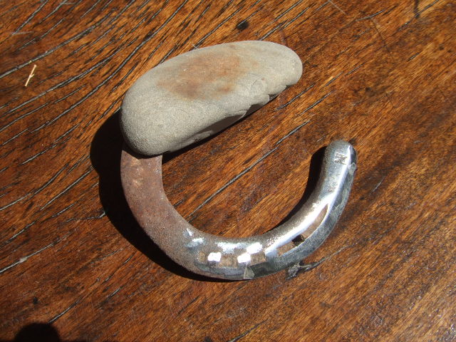 Acier de récupération, poignée galet roulé de plage, fixation colle acrylique. Poinçon. Mal poli, au disque 40-8-120, tranchant comme un rasoir.