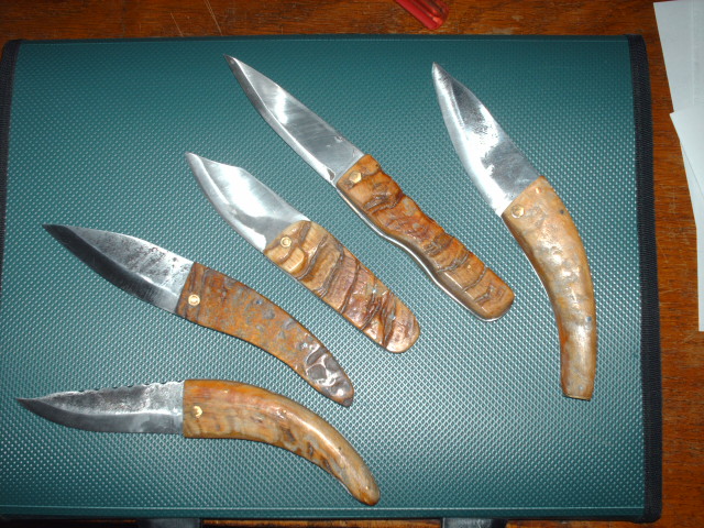 Voici mes dernières réalisations : des pliants à manches en corne de mouflon. J'ai chauffé à l'huile les morceaux de corne, ensuite je les ai mis à la presse, et laissé sécher 1 mois ; ensuite, il faut avoir soin de bien enlever toute l'épaisseur qui est devenue très friable par la cuisson. Les lames sont faites à partir de l'acier d'une lame de scie circulaire, ensuite j'ai fait du stock removal, c'est la première fois que je tente ce genre de couteaux.