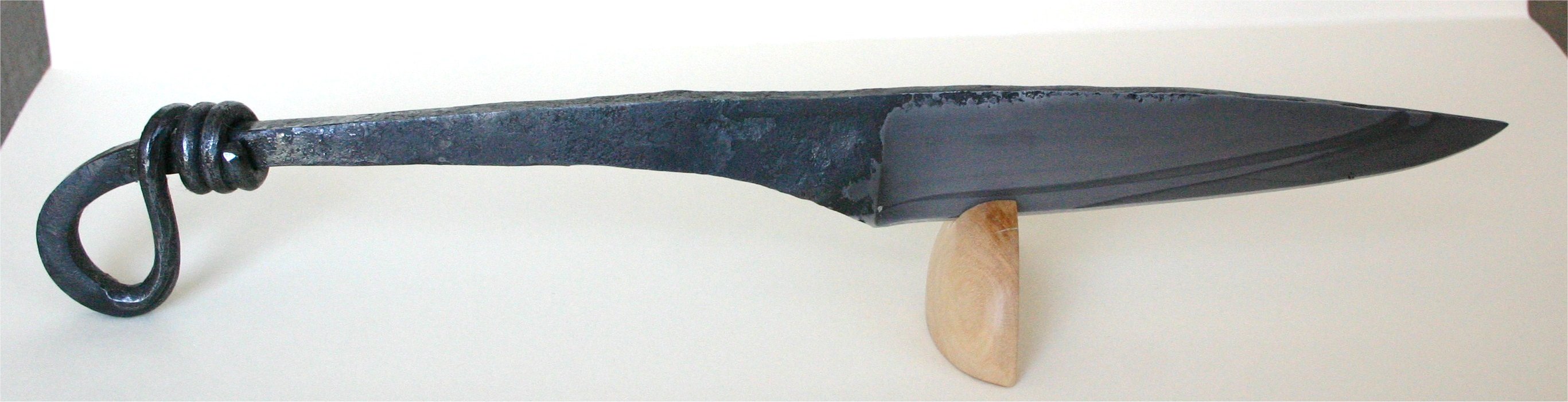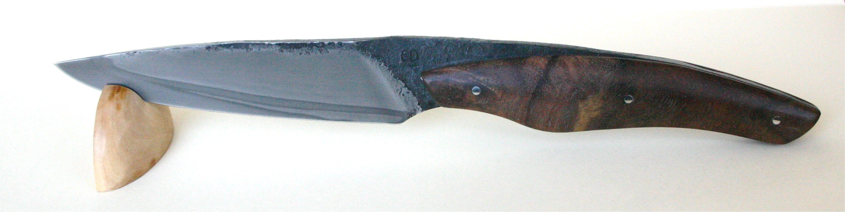 D'habitude, je fais mes trempes sélectives par chauffe sélective et trempe totalement dans l'huile ; là, c'est une chauffe totale et homogène avec trempe dans un bac de trempe... le mouvement de trempe dans le bac doit être précis pour avoir une seule belle ligne de trempe et le mien ne l'était pas assez ; ce qui fait que le bord du tranchant vers le ricasso est trempé mais un tout petit peu moins dur que la partie de la lame qui est plus vers la pointe.