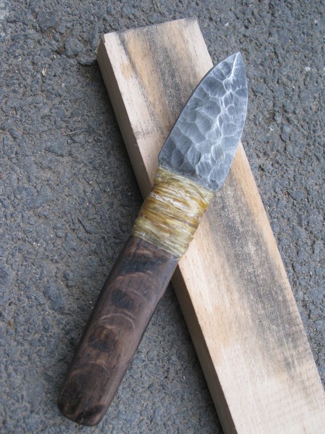 Je l'ai conçu comme un couteau de table mais à l'usage, son propriétaire après lui avoir fait le tressage, a bâtonné avec, taillé du bois en pointe, l'a lancé avec succès.