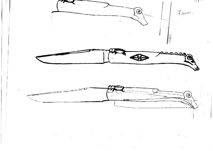 J'ai déjà beaucoup réfléchi sur le sujet, et j'ai fait les premiers dessins, ça me semble quand même assez compliqué vu le peu de place disponible sur l’arrière du couteau.