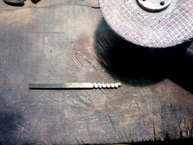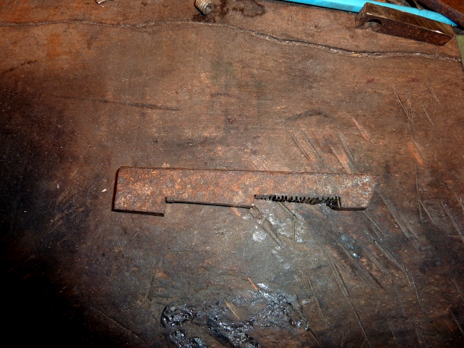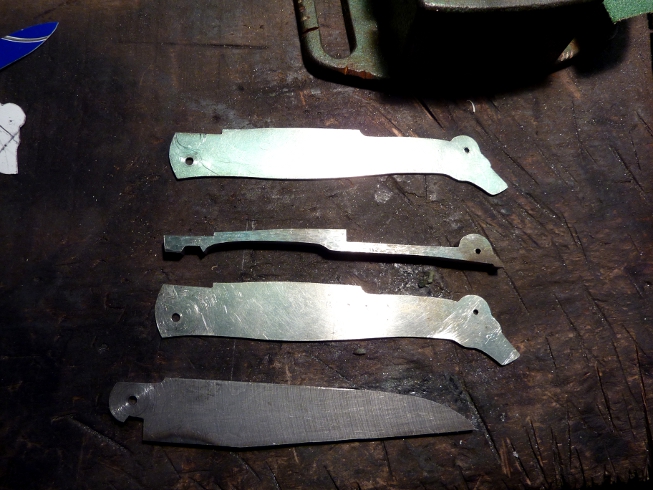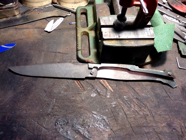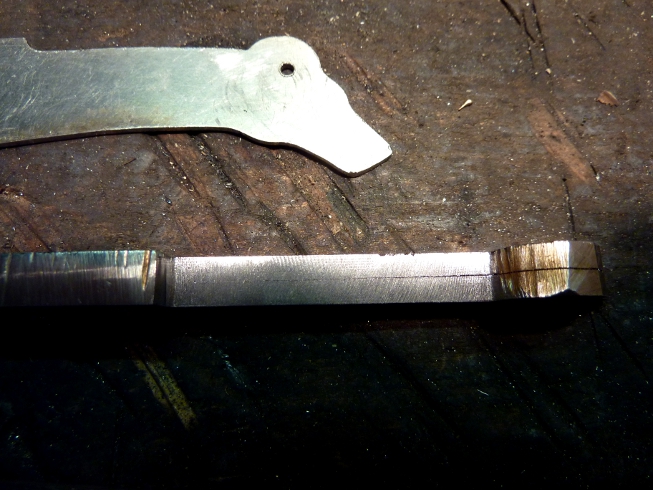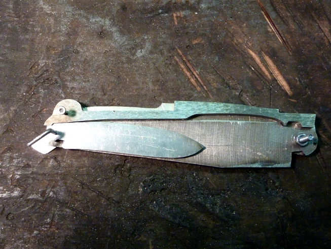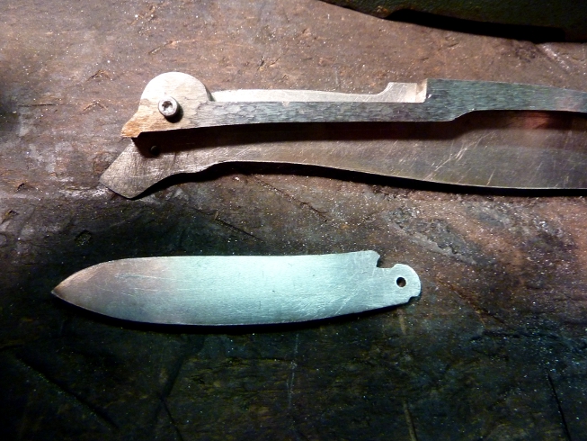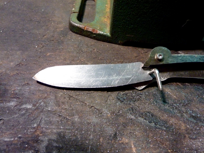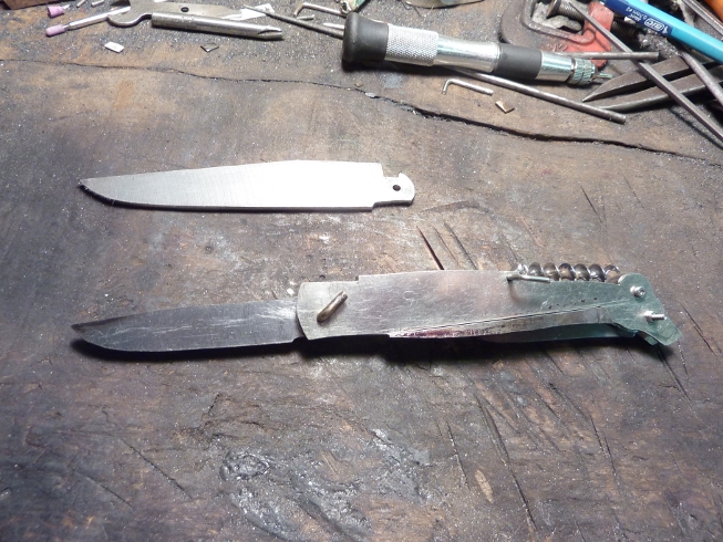 Je crois comprendre qu'il faut refendre le ressort sur la moitié de la longueur pour rendre indépendant le fonctionnement du poinçon et de la petite lame à l’arrière du couteau. Je crois comprendre aussi que le ressort ne comporte qu'un axe de fixation à l'arrière.