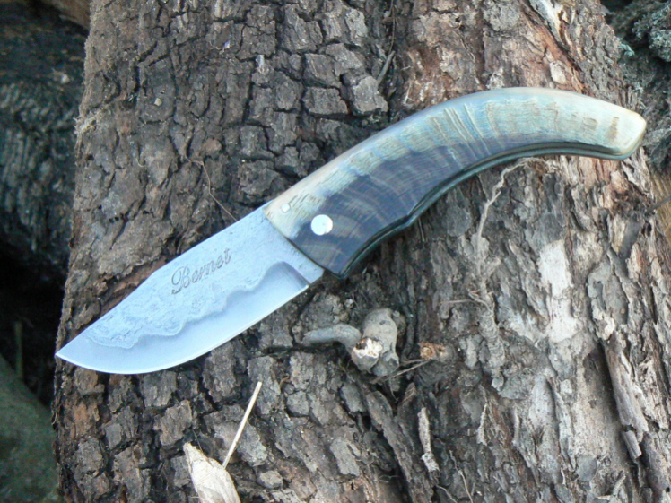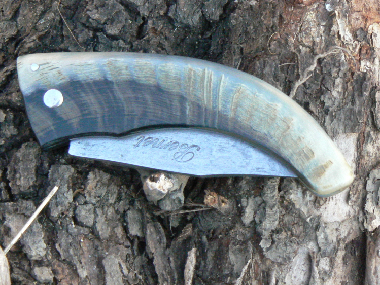 Curnicciolu, couteau pliant corse à lame en acier sandwich, manche en corne de bélier