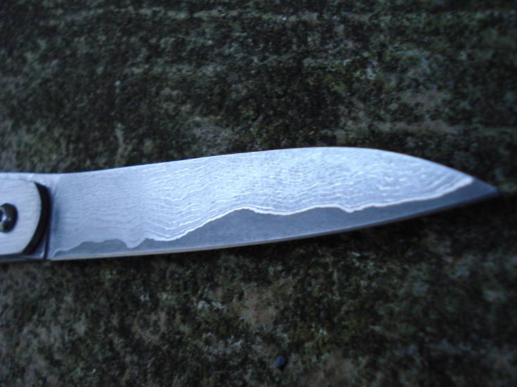 J'ai reçu un piémontais réalisé par Hiraoki Ohta. La lame en damas inox est purement et simplement magnifique. Le manche en bois d'origine avait été un peu malmené et son propriétaire voulait du titane à la place.
