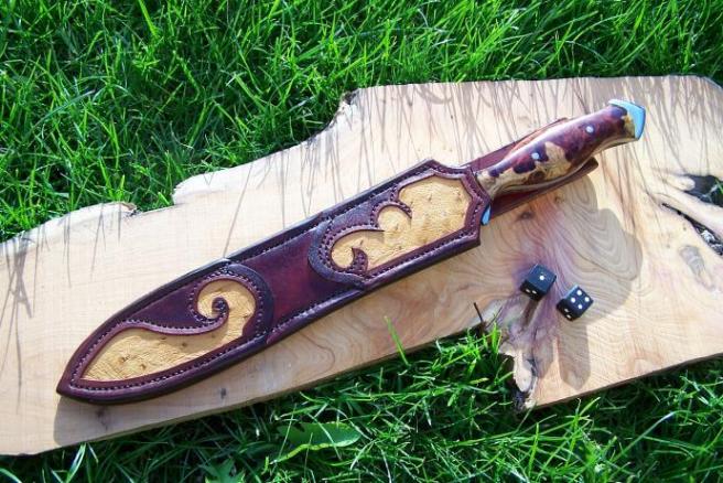 La difficulté d'avoir un double tranchant est d'être régulier avec le marteau. J'ai choisi de la loupe d'amboine pour les plaquettes rehaussées de rivets mosaïques parce qu'elles mettent bien en valeur la lame. Cette dernière est en XC75. La dague mesure 37 cm pour 21 cm de tranchant. L'étui a été réalisé naturellement par ma femme avec des inserts en peau d'autruche.